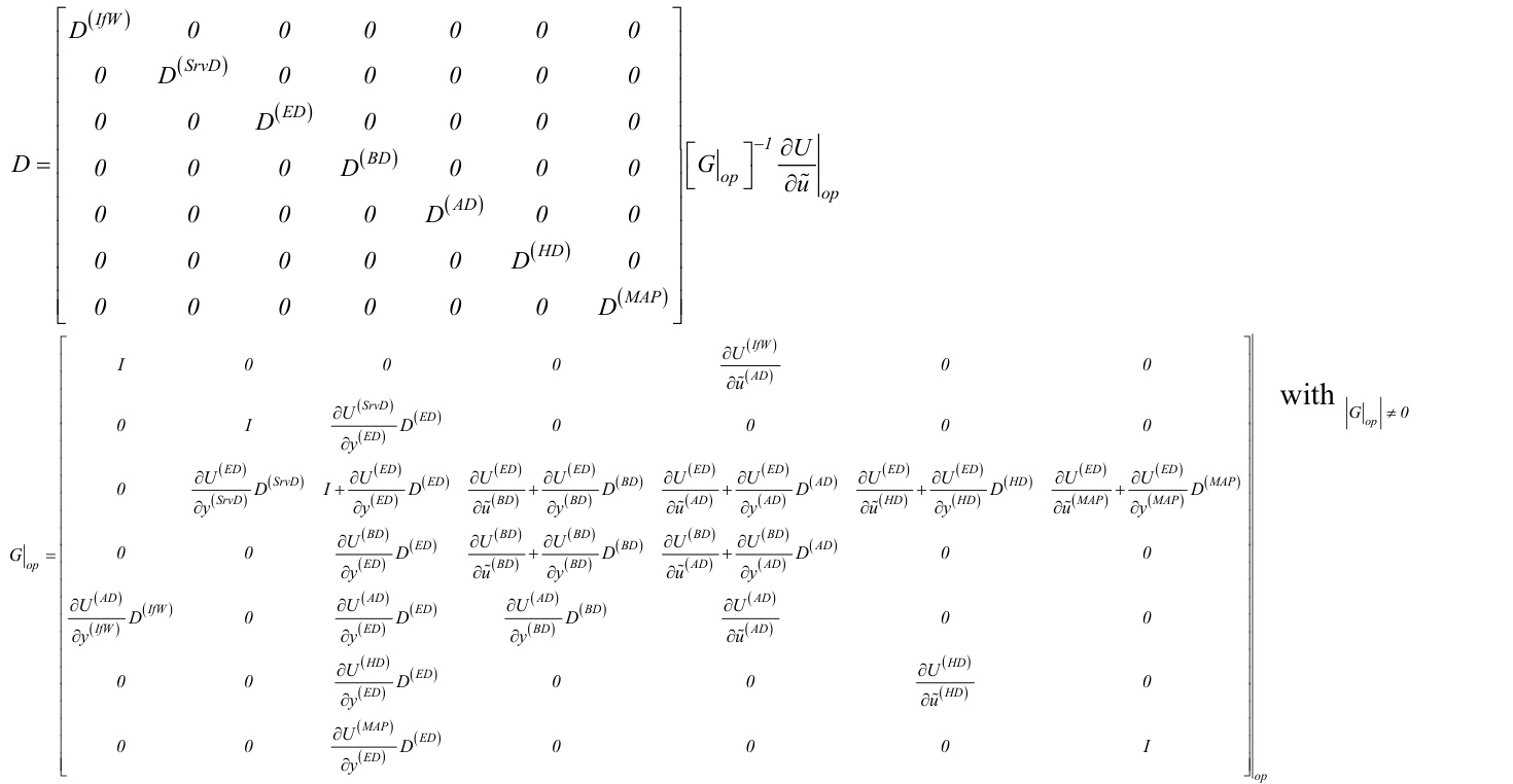 The linearization of the HydroDyn (HD) module applies to both the strip-theory solution, potential-flow solution, or a hybrid combination of the two. Linear state-space-based waveexcitation and wave-radiation models have been added to HydroDyn to enable linearization of the potential-flow solution, including wave-excitation loads (with diffraction) from disturbances of wave elevation and wave-radiation loads with free-surface memory effects. The linear state-space-based wave-radiation model was previously available in HydroDyn within FAST v8. As shown in [5], the model approximates the convolution term in the Cummins equation as shown in Eq. (1), with a linear statespace model as shown in Eq. (2), where $F_{R d t n}$ is the waveradiation loads; $K_{R d t n}$ is the wave-radiation-retardation kernels; $\dot{q}_{P t f m}$ is the floating platform translation and rotational velocities; $x_{R d t n}$ are the wave-radiation states; and $A_{R d t n}$ , $B_{R d t n}$ , and $C_{R d t n}$ are the matrices of the linear state-space wave-radiation model. The more wave-radiation states there are, the better the state-space model can approximate the convolution. Within HydroDyn, the user can select either the convolution-based wave-radiation model, which is implemented via numerical convolution using discrete-time states (which, if linearized, would overly complicate application of the linear state-space model), or the linear statespace-based wave-radiation model, which is implemented using matrices derived from the SS_Fitting preprocessor [6] or equivalent. 机组的HydroDyn (HD)模块线性化适用于带叶片理论解、势流解或两者的混合组合。为了能够对势流解进行线性化,包括来自波高扰动引起的波激载以及具有自由表面记忆效应的波辐射载,线性状态空间波激和波辐射模型已被添加到HydroDyn中。 这种线性状态空间波辐射模型以前在FAST v8版本的HydroDyn中可用。如[5]所示,该模型将Cummins方程中的卷积项近似为状态空间模型,如公式(2)所示,其中$F_{R d t n}$是波辐射载;$K_{R d t n}$是波辐射延迟核;$\dot{q}_{P t f m}$是浮式平台的平动和转动速度;$x_{R d t n}$是波辐射状态;以及$A_{R d t n}$, $B_{R d t n}$,和$C_{R d t n}$是线性状态空间波辐射模型的矩阵。波辐射状态越多,状态空间模型就越能更好地近似卷积。在HydroDyn中,用户可以选择基于卷积的波辐射模型,该模型通过使用离散时间状态进行数值卷积实现(如果线性化,会过度复杂化线性状态空间模型的应用),或者选择线性状态空间波辐射模型,该模型使用从SS_Fitting预处理器[6]或其等效物派生的矩阵实现。 $$ \begin{array}{c}{{F_{R d t n}\left(t\right)=-\displaystyle\int_{0}^{t}{{K_{R d t n}}\left(t-\tau\right){{\dot{q}}_{P t f m}}\left(\tau\right)d\tau}}}\\ {{\dot{x}_{R d t n}={A_{R d t n}}x_{R d t n}+{B_{R d t n}}{{\dot{q}}_{P t f m}}}}\\ {{F_{R d t n}\cong{C_{R d t n}}x_{R d t n}}}\end{array} $$ The linear state-space-based wave-excitation model was newly introduced in HydroDyn within OpenFAST with the addition of the linearization functionality for FOWTs. Similar to the linear state-space-based wave-radiation model, the model approximates the infinite integral shown in Eq. (3) with a linear state-space model as shown in Eq. (4), where $F_{E x c t n}$ is the wave-excitation loads under unidirectional waves; $K_{E x c t n}$ is the incident wave-excitation kernels; $\zeta$ is the wave elevation; $\zeta_{c}$ is a time-shifted wave elevation; $x_{E x c t n}$ is the waveexcitation states; and $A_{E x c t n}$ , $B_{E x c t n}$ , and $C_{E x c t n}$ are the matrices of the linear state-space wave-excitation model. Further details on this new linear state-space-based waveexcitation model are provided in Annex A. Within HydroDyn, the user can now select either a Fourier-transform-based waveexcitation model, which is implemented with discrete Fourier transforms (which is not conducive to linearization), or the new linear state-space-based wave-excitation model. 在OpenFAST中,HydroDyn新增了基于线性状态空间波激振模型,并增加了对浮式风电场(FOWT)的线性化功能。类似于基于线性状态空间的波辐射模型,该模型使用线性状态空间模型近似Eq. (3)中所示的无限积分,如Eq. (4)所示,其中$F_{E x c t n}$为单向波下的波激振载荷;$K_{E x c t n}$为入射波激振核;$\zeta$为波高;$\zeta_{c}$为时移波高;$x_{E x c t n}$为波激振状态;而$A_{E x c t n}$ , $B_{E x c t n}$ , 和 $C_{E x c t n}$是线性状态空间波激振模型的矩阵。关于该新型基于线性状态空间的波激振模型的更多细节见附录A。在HydroDyn中,用户现在可以选择基于傅里叶变换的波激振模型(该模型使用离散傅里叶变换实现,不利于线性化),或该新型基于线性状态空间的波激振模型。 $$ \begin{array}{c}{{\displaystyle F_{E x c t n}\left(t\right)=\int_{\phantom{\bigg|}E_{E x c t n}}\left(t-\tau\right)\zeta\left(\tau\right)d\tau}}\\ {{\displaystyle\dot{x}_{E x c t n}=A_{E x c t n}x_{E x c t n}+B_{E x c t n}\zeta_{c}\vphantom{\bigg|}}}\\ {{\displaystyle F_{E x c t n}\cong C_{E x c t n}x_{E x c t n}}}\end{array} $$ When linear state-space-based wave excitation or wave radiation are enabled in the potential-flow solution, continuoustime states associated with the excitation and radiation damping are included in the linearized HydroDyn model. Linearization is permitted only in still water $\(\left.\zeta_{c}\right|_{o p}=x_{E x c t n}\right|_{o p}=F_{E x c t n}\right|_{o p}=0\:)^{3}$ and is not permitted when Fourier-transform-based wave-excitation, convolution-based wave-radiation, wave directional spreading, second-order wave kinematics, or second-order potential-flow loads are enabled. The linearized form of the HydroDyn state and output equations is given by Eq. (5), where ∆x(HD)= $\varDelta x^{(H D)}=\left\{{\varDelta x_{E x c t