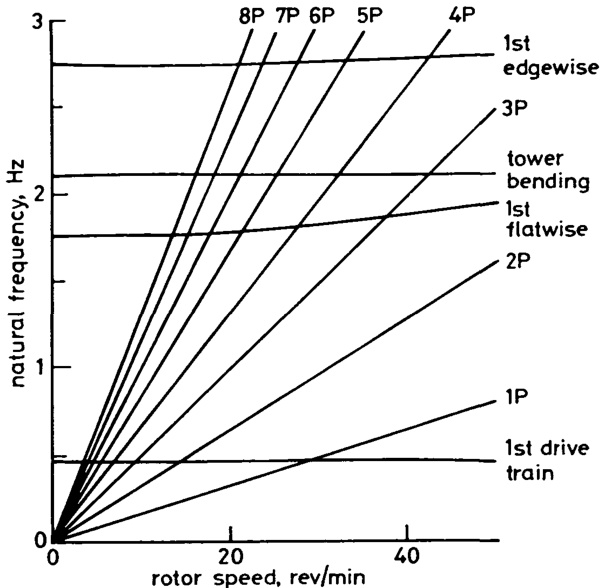 In general, each blade will see the cyclic aerodynamic loads at a frequency of once per revolution (or 1P_{,} ,and may also be affected by the harmonics. The importance of the harmonics depends on the particular load case considered. The support structure will experience the sum of the blade loads at any particular instant, and, if all the blades are identical, these loads will be modulated so that an _n -bladed rotor will give rise to loads at a frequency of n P and its harmonics on the support structure. Small amplitude loads, at frequencies other than these, will arise because of slight imbalance between the blades. This may be due to manufacturing imperfections or difference in blade setting due to operation of the control system.