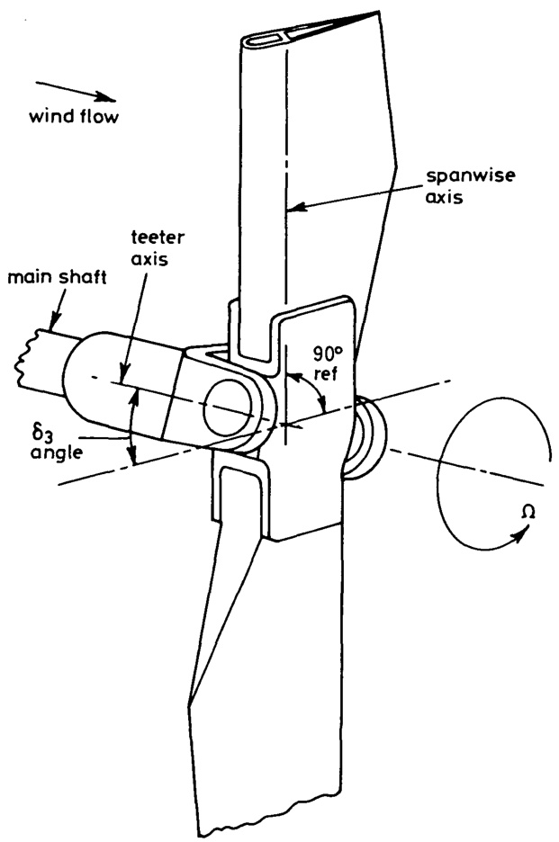The example cited was an early version of the MOD-0 machine which had a rigid hub. Later versions, and indeed most large two-bladed machines, have teetered rotors. For a rigid-hub machine, the dominant cyclic load on the shaft, nacelle and tower is the out-of-plane bending moment. Removal or reduction of this load helps considerably in the design of the components downwind of the rotor. This is achieved in two distinct ways, either by the addition of a third blade or by use of a teeter hinge. The addition of the third blade increases the rotor's symmetry so that the large periodic hub loads are greatly reduced by the spatial averaging of the three-bladed rotor. The addition of the teeter hinge, see Fig. 6, which permits the rotor to move as a rigid body out of the plane of rotation, allows the reaction to the out-of-plane moments to be derived from the considerable inertia of the rotor. The introduction of the teeter pin at the end of the shaft completely eliminates the troublesome moment loads.
