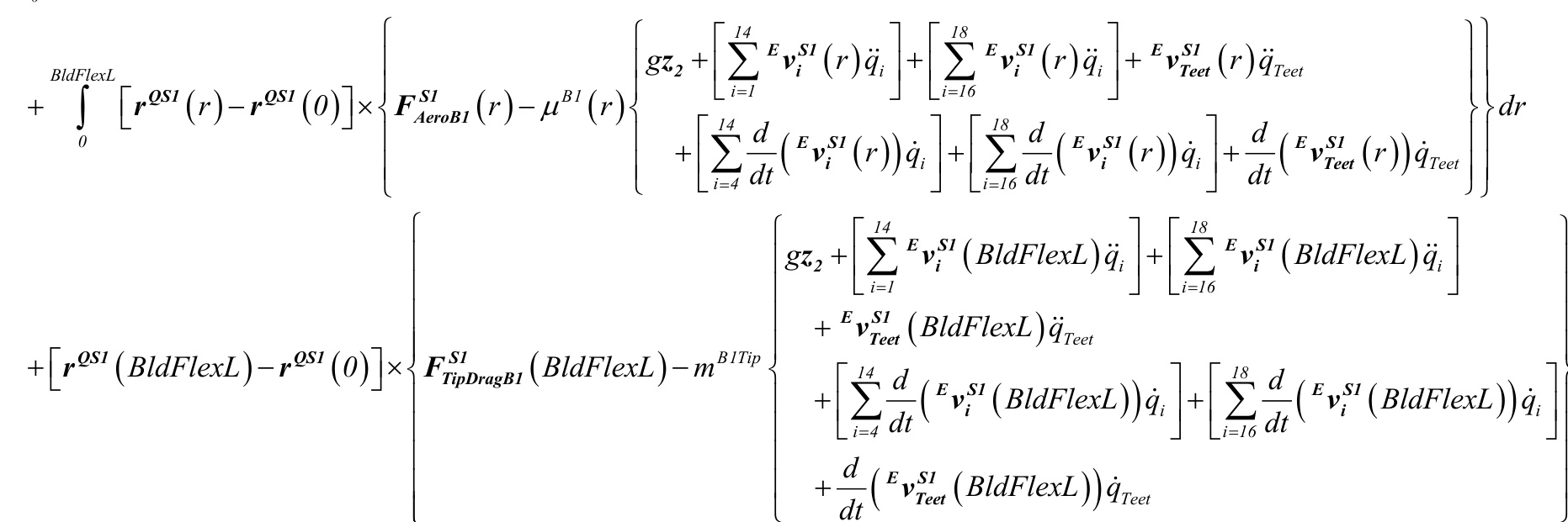 MBH1(0 ) $\begin{array}{c}{{{,,-,,}}}\ {{{,,,}}}\ {{{,,,}}}\ {{{,,,}}}\ {{{,,,}}}\ {{{,,,}}}\ {{{,,,}}}\ {{{,,,}}}\end{array}!!!!-,,\frac{B l d F l e x L}{\theta}\left(r\right)d r+\displaystyle\int_{0}^{B l d F l e x L}\left(r\right)\times!\left[F_{A e r o B I}^{S I}\left(r\right)!-!\mu^{B I}\left(r\right)g z_{2}-\mu^{B I}\left(r\right)^{E}{,\pmb{a}}^{S I}\left(r\right)\right]d r}\ {{,,}}\ {{,,}}&{{+,r^{Q S I}\left(B l d F l e x L\right)\times\left{!\frac{C S I}{\pi p_{D r a g B I}}\left(B l d F l e x L\right)!-!m^{B I T i p}\left[g\Xi_{2}+{,}^{E}{,\pmb{a}}^{S I}\left(B l d F l e x L\right)\right]!\right}}}\ {{,,}}\ {{,,}}&{{-,r^{Q S I}\left(0\right)\times\displaystyle\left{!!!\begin{array}{c}{{,,,}}\ {{,,}}\ {{,,,}}\end{array}!!!\left[F_{A e r o B I}^{S I F l e x L}\left(r\right)!-!\mu^{B I}\left(r\right)g z_{2}-\mu^{B I}\left(r\right)^{E}{,\pmb{a}}^{S I}\left(r\right)!\right]d r+F_{T i p n o g B I}^{S I}\left(B l d r\right)}}\end{array}$ r FlexL)mB1Tipgz2+EaS1(BldFlexL)