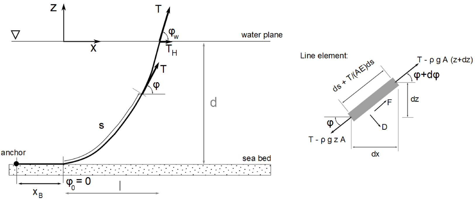 \pmb{s} is the length of the mooring line from the origin to a certain point \left({{\bf{x}},}{\bf{Z}}\right) in the line, \boldsymbol{w} is the weight (force) per unit length of the mooring line,