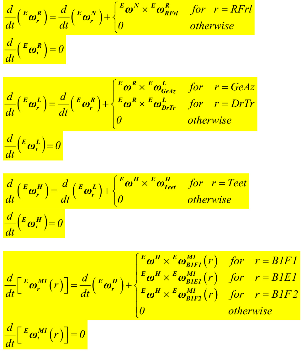\begin{array}{l}{\displaystyle\frac{d}{d t}\Big({}^{E}{\omega}_{r}^{B}\Big)=\left\{{\!\!\begin{array}{l l}{\displaystyle E_{{\pm}}{\omega}^{X}\times{}^{E}{\omega}_{r}^{B}}&{\displaystyle f o r\ \ r=7,\mathrm{}\mathrm{\it{\mathscr{S}}},\ldots,{\it{\it{10}}}}\\ {\displaystyle O}&{\ o t h e r w i s e}\end{array}}\right.}\\ {\displaystyle\frac{d}{d t}\Big({}^{E}{\omega}_{{\iota}}^{B}\Big)=\cal{O}}\end{array} E E N for r=Yaw