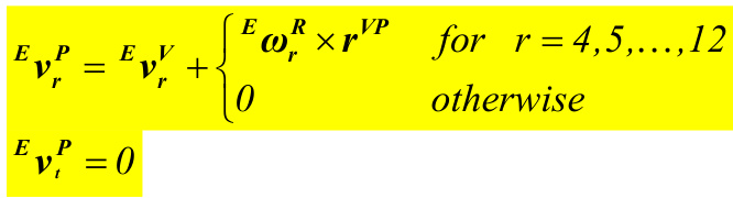 {}^{E}{\pmb{\nu}}^{P}={}^{E}{\pmb{\nu}}^{V}+{}^{E}{\pmb{\omega}}^{R}\times{\pmb{r}}^{V P}