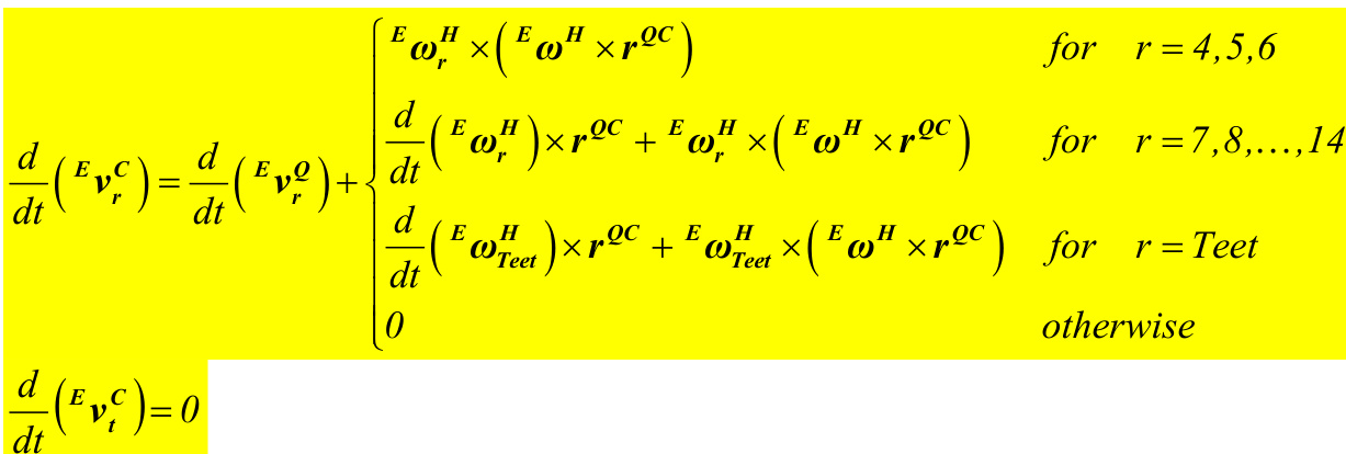 Recall that: {}^E{\alpha}^{X_{i}}\left(\ddot{q},\dot{q},q,t\right)\!=\!\!\left(\sum_{r=1}^{22}{}^E{V_{r}^{X_{i}}}\left(q,t\right)\ddot{q}_{r}\right)\!+\!\!\left[\sum_{r=1}^{22}\!\frac{d}{d t}\!\left({}^E{V_{r}^{X_{i}}}\left(q,t\right)\right)\!\dot{q}_{r}\right]\!+\!\frac{d}{d t}\!\left({}^EV_{r}^{X_{i}}\left(q,t\right)\right) for each point X_{i} in the system. Note that the {\frac{d}{d t}}{\Big(}^{E}\nu_{r}^{X_{i}}{\Big)} terms are all vector functions of \left({\dot{q}},q,t\right) and that all of the {\frac{d}{d t}}{\Big(}^{E}\nu_{t}^{X_{i}}{\Big)} terms are zero as will be shown.