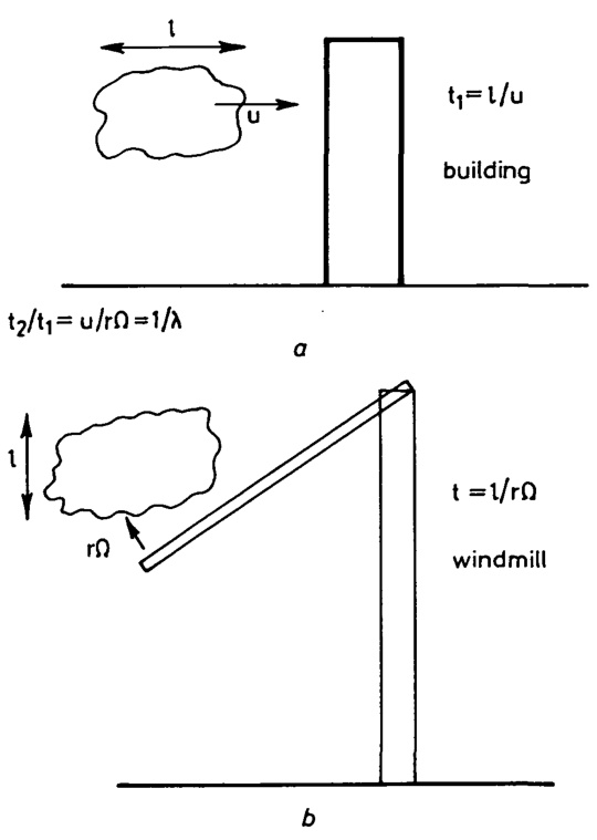 It is useful to consider a turbulent eddy being convected past a structure. Consider, first, a stationary structure, as in Fig. _{7a} ; if the eddy has a length l and the mean wind speed is \pmb{u} .a useful parameter is the time taken for this eddy to pass the building, which may be derived as t_{1}= \boldsymbol{l}/\boldsymbol{u}. . Now consider the same situation, except that the stationary structure is replaced by a rotating blade, Fig. 7b. For a point on the blade moving at a speed r\Omega , the time for the passage of the eddy is now the time taken for the blade to cut through it t_{2}=l/r\Omega. The time is therefore considerably smaller for the turbine blade than for the stationary structure, the ratio being u/r\Omega_{:} . or the inverse of the local speed ratio 1/\lambda . This process has the effect of moving the turbulent energy to higher frequencies and, in particular, to harmonics of the rotor speed; this is shown graphically in Fig. 8.
