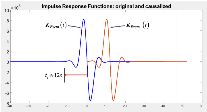 An approximately causal IRF is obtained through a timeshifting method. Figure A.1 shows that for all times less than -t_{c} ( t_{c}\approx I2 s for this example), the IRF is approximately zero. A time delay, t_{c} , is introduced to shift the original IRF to obtain a “causalised” IRF, K_{E x c t n_{c}}\left(t\right)=K_{E x c t n_{c}}\left(t-t_{c}\right). . Figure A.1 shows that this time-shifted IRF (red) is approximately zero for negative time. Equation (A.4), in terms of K_{E x c t n_{c}}\left(t\right) and \zeta_{c}\left(t\right) , follows directly from Eq. (3) and the time-shift properties of Fourier transforms, where \zeta_{c}\left(t\right)=\zeta\left(t+t_{c}\right) is the wave elevation predicted at time t_{c} into the future. To implement this approach, a wave-prediction model must be used to predict the wave elevation for future times. Within OpenFAST simulations, this is not an issue because the wave elevation is precalculated at model initialization, so the future wave elevations are already available. In practice, the future wave evaluation could be estimated (e.g., by measuring the wave elevation with a buoy and approximating the wave evolution).