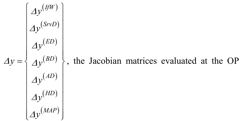 from Eq. (8) for these seven modules are given by Eq. (9), where I and \boldsymbol{\theta} are appropriately sized identity and zero matrices and the sub-Jacobian matrices are composed of I\mathrm{~s~} , \theta\;\mathbf{s}. , and the linearized matrices from the mapping transfers given in [2].