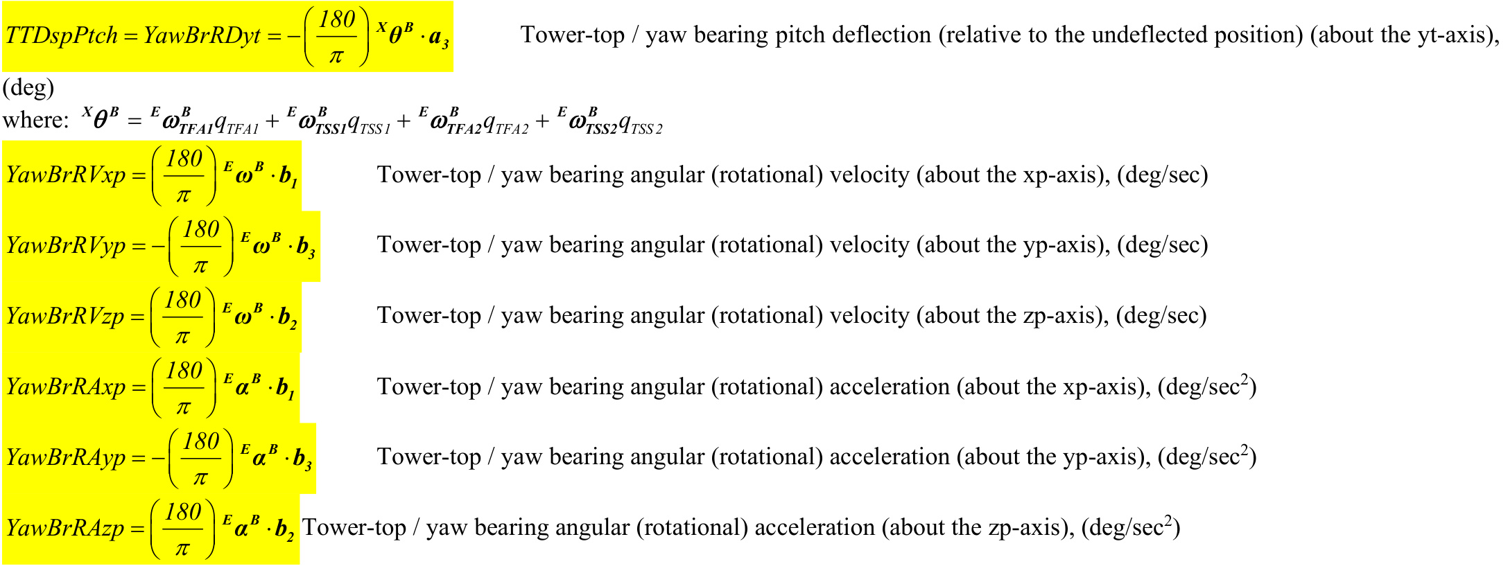| 180 PtfmRVyi = qp π | Platform pitch tilt velocity (about the yi-axis), (deg/sec) |