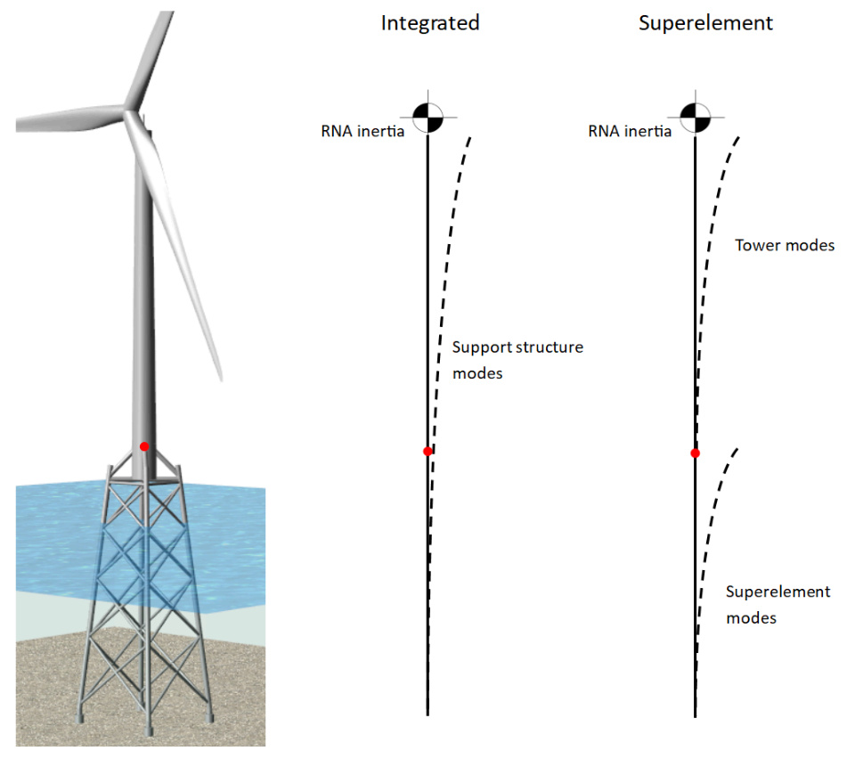 The traditional use of standard, commercial finite element analysis software packages for solving problems of structural dynamics is challenging in the case of wind turbines. This is because of the presence of rigid body motion of one structural component, i.e.the rotor, with respect to another, i.e. the tower or another support structure type. In principle, the standard finite element method only considers structures in which the deflection occurs about an initial reference position, and for this reason the finite element models that have been developed for wind turbine in the past have been tailored to deal with this problem.